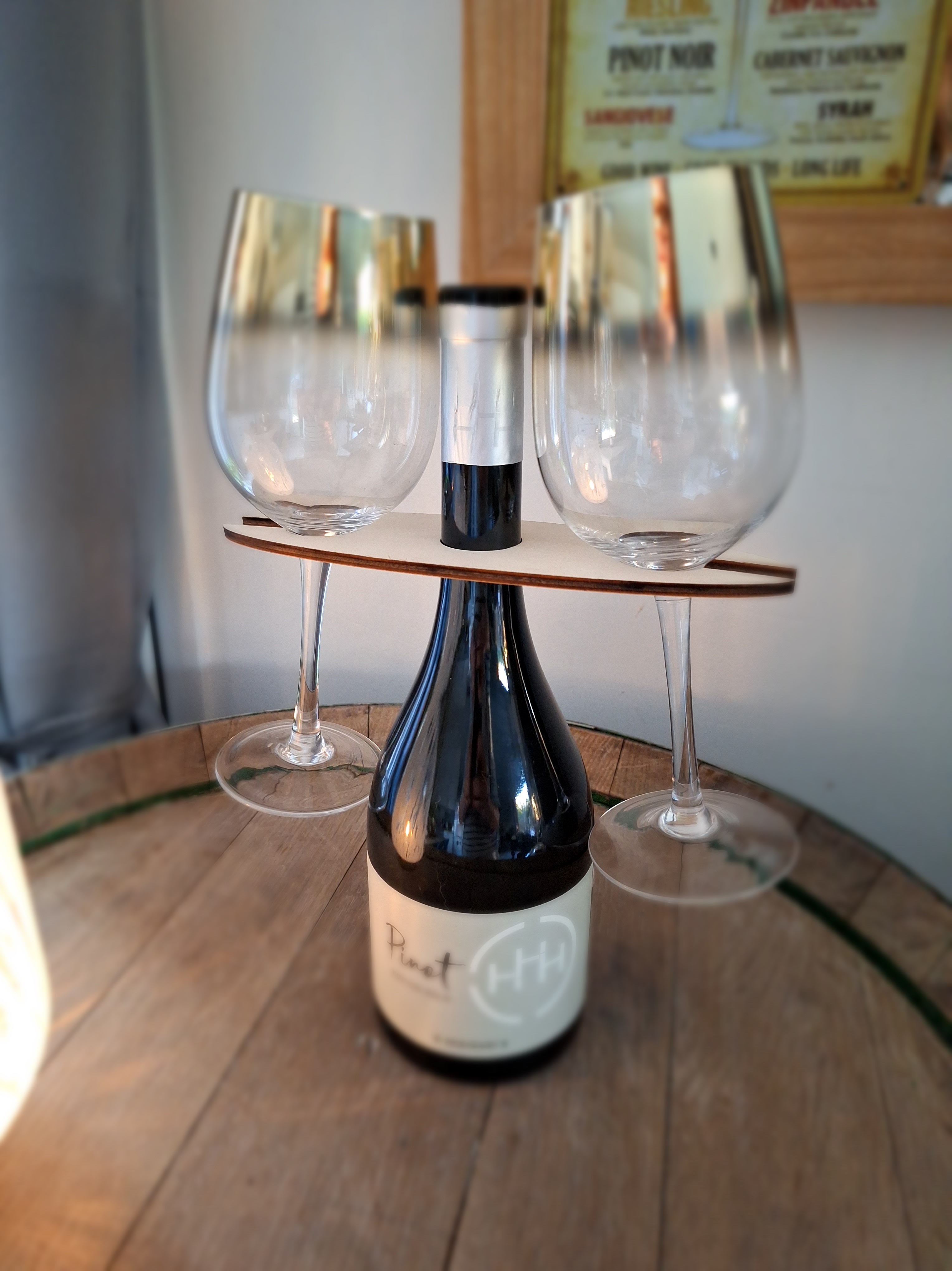 Porte-bouteille de vin créatif, pièce artisanale en bois. Accessoire en bois pour duo amateur de vin. Boire son vin à deux devient plus facile, quelque soit l’endroit